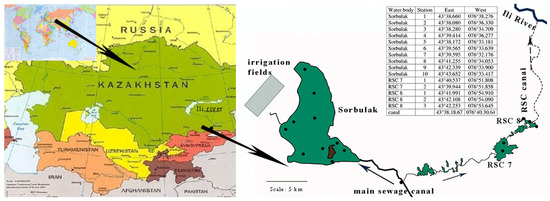 Material sampling was carried out in Sorbulak and two ponds (RSC 7 and RSC 8) once a month from April to September 2021 using a grid of 15 stations (Figure 2, black circles). In June, additional samples were taken in the wastewater canal, 6 km upstream of its confluence with Sorbulak. The pH and water temperature were measured using an AMTAST portable waterproof Pen pH meter. Water transparency was determined using a Secchi disk with a diameter of 30 cm. At each station, water samples were taken to analyze the chemical composition (Ca, Mg, Na + K, Cl, SO4, CO3, HCO3), total dissolved solids (TDS), the content of nitrite-nitrogen (N-NO2), nitrate-nitrogen (N-NO3), ammonium nitrogen (N-NH4), phosphates (PO4), total iron (Fe), silicon (Si), manganese (Mn), oxygen, readily oxidizable organic substances (PI permanganate index), cadmium (Cd), lead (Pb), Zn (zinc), copper (Cu), chromium (Cr), cobalt (Co), as well as zooplankton samples. At depths of less than 5 m, hydrochemical samples were taken from the surface horizon. At depths of more than 5 m, samples were taken using a bathometer with a volume of 1 dm3 at different horizons (at least three horizons). Water was poured into a container, mixed, and one integral sample was taken. Samples for TDS were taken in plastic containers with a volume of 1 dm3, heavy metals—0.5 dm3 (conservation with concentrated chemically pure nitric acid), nutrients—in glass containers with a volume of 0.5 dm3 (conservation with 1 cm3 of chloroform), readily oxidizable organic substances (permanganate index PI)—in glass containers with a volume of 0.25 dm3 (conservation with sulfuric acid), oxygen—in oxygen bottles with a ground stopper with a volume of 0.25 dm3 (conservation with a solution of Mn chloride in an alkaline medium). Water samples were delivered to the laboratory for further analysis within 24 h. Zooplankton samples were collected using a small Juday plankton net (top length 12 cm, bottom length 45 cm, input diameter 12 cm, mesh size 64 μm) by pulling it from the bottom to the surface [31]. Samples were fixed with a 4% formaldehyde solution. A total of 84 water samples were taken for each type of analysis.