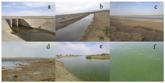 Wastewater canal 6 km upstream of the confluence with Sorbulak (a,b), the coastal zone of Sorbulak (c,d), RSC 8 (e), suspension of cyanobacteria in RSC 7 (f). Photos by E. Krupa.