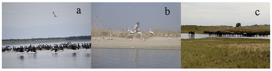 Although Sorbulak and ponds are fed mainly by wastewater, many birds live on the islands and coastal zones (Figure 3a,b). The concentration of birds in this area is due to several reasons–the location of the reservoirs on the path of bird migration, a general shortage of water resources in the region, a good food supply, and a relatively low disturbance factor. Sorbulak and the entire system of wastewater reservoirs is a crucial ornithological area, and it is included in the list of wetlands of regional importance [30]. Carp species of fish live in the reservoirs, among which Cyprinus carpio Linnaeus reaches the largest number and larger mass than individuals from natural water bodies.