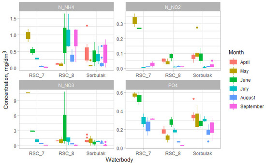 The seasonal dynamics of nitrogen and phosphorus compounds in Sorbulak and RSC 7 did not follow clear patterns, with a weakly expressed trend of decreasing from April to September (Figure 4). In RSC 8, the maximum N-NO2, N-NO3, and PO4 were recorded in June, and N-NH4—in July. In Sorbulak, the highest amount of Cu was detected in June, in ponds in August. In August, an increased amount of Cr was registered in Sorbulak.