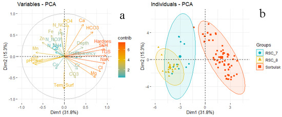 The biplot (Figure 5b) demonstrates that the environmental variables formed three clusters according to each wastewater reservoir. The geometric centers of the clusters (the most prominent circles of the corresponding color) did not coincide, which indicated the differences in environmental conditions in each of the wastewater reservoirs. The most clearly identified environmental variables related to Sorbulak. They characterized mainly the chemical composition of water (bicarbonates, sulfates, chlorides, alkali and alkaline earth metals, hardness, TDS). The same quadrant contained PI, depth, and transparency. The second and third clusters overlapped and pooled wastewater ponds variables. They were grouped in opposite quadrants, indicating a negative correlation with the variables of the first cluster. Environmental conditions in RSC 7 were characterized by increased Fe, Zn, N-NH4, and N-NO3, and in RSC 8 by increased pH, Si, Cu, and Mn.