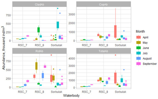 In the zooplankton of RSC 8, the set of dominant rotifer species was the most unstable. In April, it included Filinia major and F. terminalis; in May, Keratella quadrata; in July, Asplanchna brightwelli; in August, Brachionus forficula; in September, B. forficula and Asplanchna girodi. Cladocerans B. longirostris and Diaphanosoma cf. dubium played a notable role only in June and July. In months, there was also a change in the composition of the dominant species among the copepods. From April to May, the proportion of cyclops C. vicinus decreased. In May, the abundance of heat-loving A. robustus increased, and it retained its Pbing position in the community in the summer months. In July and August, the composition of the dominant species was replenished with diaptomus Sinodiaptomus sarsi, with cyclops Thermocyclops vermifer in August and September.