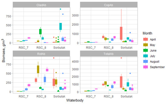 The dynamics of the quantitative variables of zooplankton in all of the wastewater reservoirs have their features (Figure 7 and Figure 8). In Sorbulak, after a high abundance of planktonic invertebrates in April, a decline followed in May and June, followed by a rise in July and a further decrease in September. In RSC 7, the quantitative variables of zooplankton gradually increased from May to September. RSC 8 has two zooplankton abundance peaks (May and September) and one biomass peak (June). Pearson’s correlation coefficients in seasonal variability of biological variables between wastewater reservoirs were not statistically significant.
