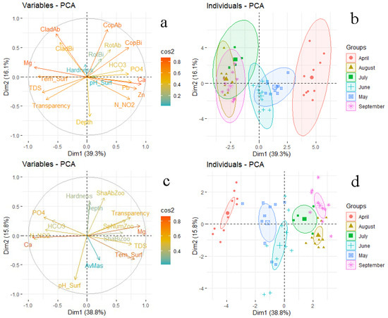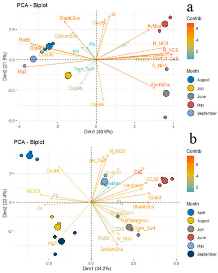 Biplot PCA demonstrates the relationship between environmental and biological indicators and the season (Figure 9a,b). The first cluster combined April, the second—May and June, and the third—July, August, and September. April was characterized by the highest content of Ca, HCO3, PO4, Pb, Zn, high abundance of rotifers and copepods. In May and June, the lowest abundance of all groups of planktonic invertebrates, an increased amount of N-NO2, and a lower content of Ca and HCO3 compared to April were recorded. The characteristic features of the months combined into the third cluster (July, August, September) were high values of TDS, Mg, hardness, transparency, temperature, and a high abundance of cladocerans.