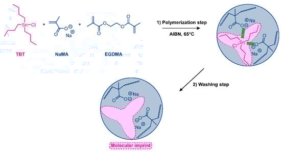The presence of OSn is still a problem, especially in port areas where they can be resuspended during dredging operations []. In view of the extremely low environmental quality standards adopted and the complexity of the seawater matrix (presence of salts, ionic species, and biota), it is necessary to develop alternatives to spot samples that are not representative of the contamination of the environment. Successfully used as a preconcentration technique (solid phase for selective extraction (SPE)), the objective of the present study is to synthesize an OSn-specific molecularly imprinted polymer in order to provide a new application as a receptor phase for an OSn-specific passive sampler. In this study, bulk, suspension, and mini-emulsion polymerizations have been tested to obtain the MIP particles and accumulation kinetics of MBT and DBT, and TBT by MIPs have been performed in tap water.