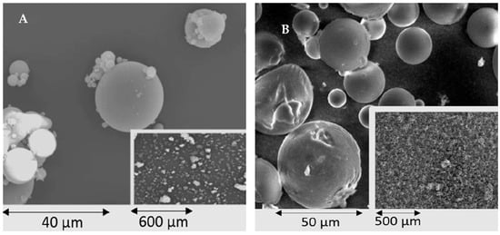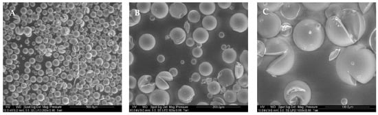The suspension polymerization is more difficult to set up because of the use of two solvents to create an emulsion. However, the result obtained (Figure 3) shows that the particles synthetized are perfectly spherical and the particles range in size from approximately 10 µm to 40 µm. The size differences between particles can be due to turbulences in the reactor during the emulsion and polymerization. For these polymer particles, they also appear to have a non-porous surface; the compounds’ retention will be then carried out to the surface of particles homogeneously thanks to their spherical fate. However, the particle size obtained allows for the increasing of specific surface area and should improve the quantity of butyltin compounds trapped at the surface of MIPs. The particles obtained in this experiment are similar to those synthetized by Gallegos-Gallegos []. A suspension synthesis has also been found with the same procedure but with 10 times less polyvinyl alcohol, to evaluate the impact of aqueous phase viscosity on particles synthetized. The particles obtained (Figure 4) present bigger sizes ranging from 30 µm to 100 µm, which may be due to bigger droplets formed during emulsion. Furthermore, close to the totality of particles seem to be broken, a phenomenon that can occur during solvent vaporization while breaking a particle’s structure.