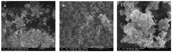 Scanning electron microscopy pictures of mini-emulsion synthesized MIPs zoomed in 200 times (A), 1600 times (B), and 50,000 times (C).