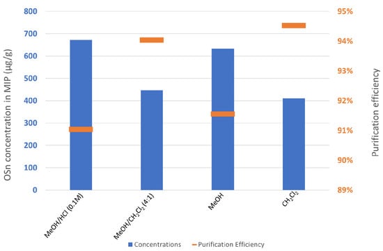 The results obtained during the washing steps of bulk synthetized polymers are shown in Figure 6. In this part, the Soxhlet and solvent washing steps have not been differentiated. These results highlighted the removal efficiency of OSn with different solvents, particularly with dichloromethane (CH2Cl2) and the methanol/dichloromethane (3:1) mixture with removal efficiencies close to 94% (around 4 mg g−1 to 5 mg g−1 remaining in volume and surface). This is in accordance with the results of Gallegos []. However, despite more than 90% removal efficiency, this result remained too high for environmental uses where concentrations found were very low, around 1 ng L−1 (European Water Framework Directive, fixed an annual average to 0.2 ngSn·L−1). Further studies are needed to improve these results and leave MIPs fully free of OSn. Other washing solvents could be tested with stronger bindings with OSn or different washing set-ups such as cascade washes or higher contact time between the solvent and the MIP. Furthermore, as the surfaces of MIPs are non-porous, the solvent cannot reach the enclosed TBT within the particles. This could lead to leakages if particles break during uses.