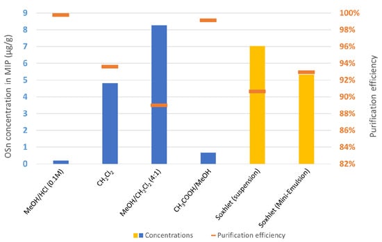 In this study, other types of solvents have been used during suspension MIP washes. The removal efficiency after the Soxhlet step is also presented here for the suspension and mini-emulsion of MIPs. As we can see in Figure 7, the removal efficiencies after the Soxhlet steps are already more than 90%. The Soxhlet allows for the removal of polymerization residues and the butyltin present in the polymer. Furthermore, the washes performed after the Soxhlet allows it to reach more than 99% with a mixture of acetic acid (CH3COOH)/methanol (3:1), as well as being used for the OSn extraction before GC-ICP-MS analysis, and almost 100% with a mixture methanol/hydrochloric acid (HCl) (0.1 M). Contrary to the bulk synthetized MIP, the suspension MIP seems to be better washed with these two solvents but not with CH2Cl2 or the MeOH/CH2Cl2 (4:1) mixture, which allowed for reaching the removal efficiencies of 94% and 90%, respectively.