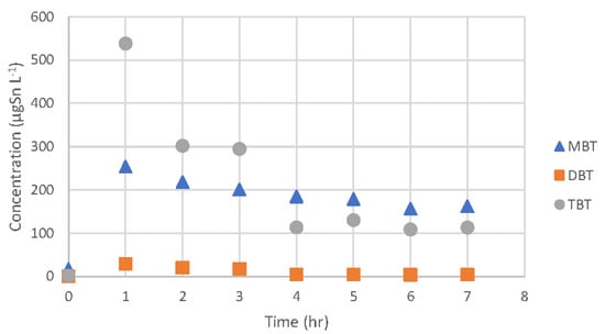 Butyltin compounds such as monobutyltin (MBT), dibutyltin (DBT), and tributyltin (TBT) are known to be among the most hazardous compounds for both humans and aquatic ecosystems. Consistent effects of these compounds in the aquatic environment have already been observed at concentrations under 1 ng L−1 [,]. Huge amounts of OSn have been used for years in several activity sectors as antifouling paints for boats, namely a biocide to protect the hull. OSn have also been used as stabilizers in PVC, as well as pesticides and bactericides [,,]. In 1999, the United States Environmental Protection Agency (US-EPA) [] recommended a maximum of 10 ng L−1 of TBT (as a cation) in seawater and 63 ng L−1 in freshwater. Meanwhile the European Environmental Quality Standard (EQS) of TBT for all types of waters covered by the Water Framework Directive (WFD) have been set at 0.2 ng L−1 for annual average concentration, and a maximum allowed concentration set at 1.5 ng L−1 in unfiltered water samples []. However, despite these regulations, OSn are used (heat stabilizer, catalytic agents, and biocidal) and are still present in the environment []. Indeed, sediments are both a sink and a source of butyltin in which their stability has been evaluated at about ten years []. The measurement of the concentration of these pollutants in the water column is therefore important for assessing their potential long-term biological impact.