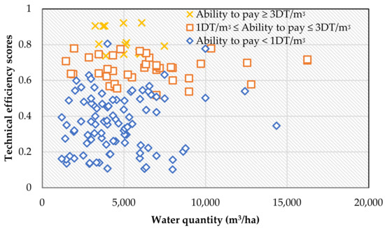 Technical efficiency scores per quantity of water consumed and ability to pay. Source: Own elaboration based on model results (2022).