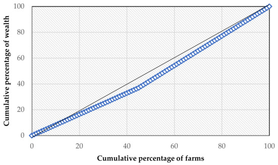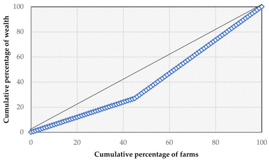 For our calculation and Lorenz curve estimation, we consider the average values of yields and benefits obtained from these quantities. In this scenario, the Gini index decreases to 0.145, showing that a better water reallocation can improve wealth distribution equality. In addition, the Lorenz curve shows that currently, 45% of the sample possess 30% of the accumulated benefits; however, after penalisation, if the same water reallocation is accompanied by technical efficiency maximisation for both groups, then the Gini coefficient becomes very low (0.094); this corroborates our conclusions: a penalisation can reduce distribution water inequity accompanied by optimisation of water and other input use and improve welfare for the whole sample and the equality of wealth distribution with the result that 50% of cumulated benefits are received by 55% of farmers (Figure 4, Figure 5 and Figure 6).