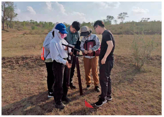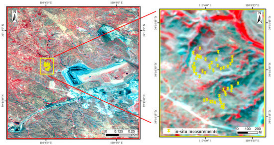 The ground truth SM values were collected on 14 May 2021 in the Shangwan mine area (Figure 1) with the FieldScout TDR 350 Soil Moisture Meter. The instrument can measure the SM value at depths of 3.8 cm, 7.6 cm, 12 cm and 20 cm under the ground surface. Considering that the surface SM monitored by the SPL2SMAP_S data is at a 0–5 cm depth, the SM values at the depth of 3.8 cm were measured in the fieldwork. A total of 54 ground truth SM values were measured within a window of 2 h concerning the Sentinel-1 acquisition time. During the fieldwork, each sample point was measured three times and the average was taken as the truth SM value to verify the accuracy of the downscaled SM value. Figure 2 shows a sample point in the field survey, and Figure 3 demonstrates the spatial distribution of the in situ measurements.