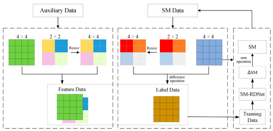 Based on the proposed SM-RDNet, we design the strategy of downscaling the SPL2SMAP_S SM products, and take the residual value (∆SM) between two SM images with different spatial resolutions as the label dataset [61]. Figure 5 shows the flowchart of downscaling strategy, and the detailed process is as follows: