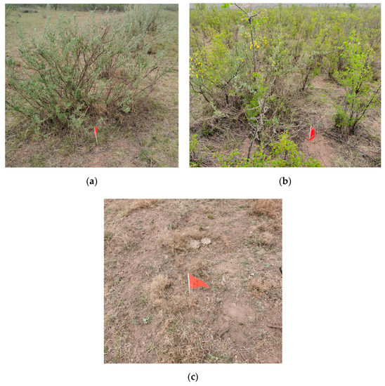 The pictures for (a) Sophora davidii, (b) Siberian almond tree and (c) sparse grass in the study area.