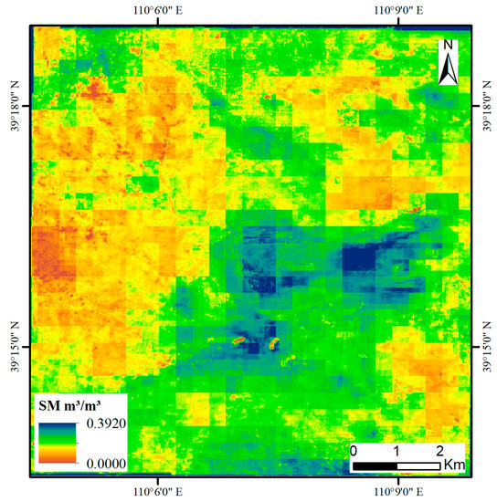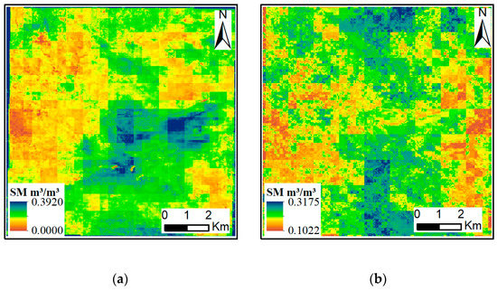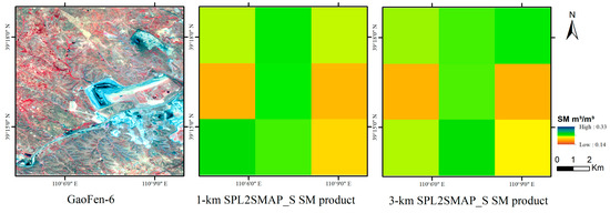 Figure 9 and Figure 10 show the spatial distribution of the downscaled SMs derived from the 1 km and 3 km SPL2SMAP_S SM products, respectively. Figure 11 shows the GaoFen-6 remotely sensed image with the 2 m spatial resolution and the SPL2SMAP_S SM products with the 1 km and 3 km spatial resolutions in the study area.
