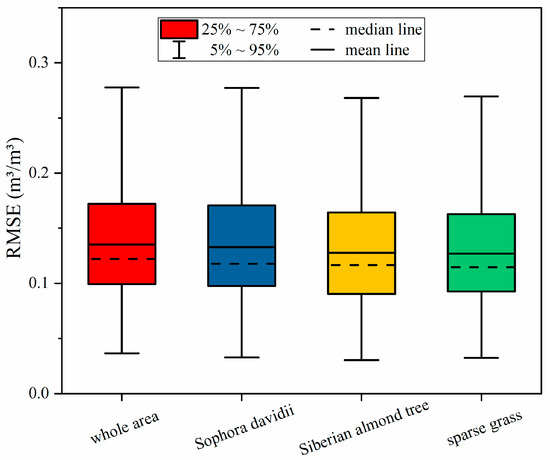 The boxplot of downscaled SMs’ accuracy in the whole area and the single vegetation covers.