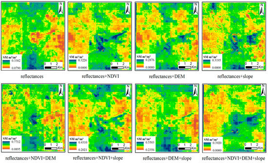 An integrated analysis of Table 2 demonstrates that the use of NDVI, DEM or slope as an auxiliary dataset can improve the downscaling accuracy to a certain extent compared with using the reflectances alone. Among them, NDVI is most effective in increasing the downscaling accuracy. Furthermore, the performance of downscaling SM in a single vegetation cover is better than in the area with mixed vegetation covers.