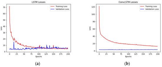 Moreover, Figure 7 shows the performance of the 12 h-ahead flood forecasting models. The results were created using the training validation data to determine the losses, based on a statistical analysis, using the LSTM models. The validation and training losses can be analyzed on a graph of loss and epoch number. Epoch numbers were chosen to create an optimal fit in the data, which neither under nor overfits. It can be observed that the LSTM and ConvLSTM models had the highest performance, as indicated by the good fit relationship at approximately 200 epochs. The STA-LSTM and CNNLSTM model proved to be less than optimal, as neither displayed a good fit relationship.