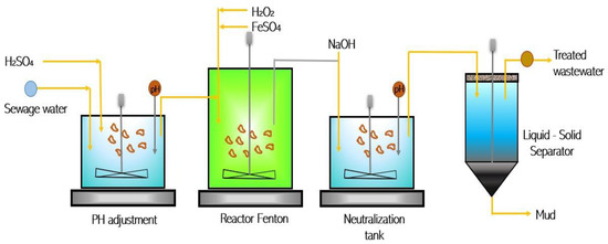 Modified FR consists of the introduction of iron shavings as a source of Fe2+ cations in order to increase the efficiency of removal and degradation of contaminants such as drugs of abuse [72,73]. Figure 2 illustrates the general process of the modified Fenton reaction.