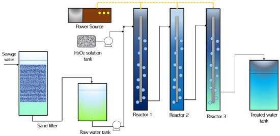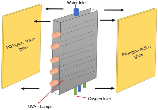Aziz et al. (2019) indicates that the photocatalytic treatment allows the degradation of pharmaceutical products, but it has a low mineralization rate, making it impractical for the complete elimination of diclofenac (DCF) and ibuprofen (IBP), since it requires a long period of time for a high reaction [92]. However, it mentions that it is effective for the degradation of recalcitrant organic contaminants, such as pharmaceutical residues, or, at least, to transform them into biodegradable species [93,94,95,96]. The schematic diagram of the photocatalytic reactor is shown in Figure 5.