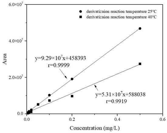 The determination of GLUF-P in samples without derivatization was adopted in some studies []; however, the levels of testing conditions were high. The chromatographic columns should have good retention performance to avoid the test substance being eluted too fast to be detected, and MS detectors in the determination systems were also necessary. However, the shortcomings of such a method include an obvious matrix effect, poor peak shape and column damage []. GLUF-P in the complex matrix of the soil sample was determined by HPLC with fluorescence detection after derivatization in our study referring to available data, in which results with high sensitivity without matrix effects were expected to be attained. In this section, the effects of the derivatization temperature and period on the determination are mainly discussed: the blank quartz sands that replaced the soil were pretreated according to the methods in Section 2.5 and Section 2.6, and then, the extract obtained was used as a solvent to prepare the matrix working solutions at 0.005~0.5 mg/L. The matrix working solutions were subsequently derivatized at 25 °C and 40 °C separately according to the methods in Section 2.7 and were finally determined by HPLC under the conditions of Section 2.8, and the working curves at different temperatures were plotted separately. The measured working curves are shown in Figure 1 by the end of the 1 h derivation time. The linear correlation coefficient r of the working curve at 25 °C was higher than 0.999. The corresponding peak area values for the same concentrations of working solutions at 40 °C were significantly lower than those at 25 °C. The chromatographic response to the derivatives at 40 °C was approximately 40% of that at 25 °C. When the concentration of GLUF-P was 0.005 mg/L, the derivatization effect at 40 °C was less unsatisfactory. Therefore, 25 °C was the optimum derivatization temperature of GLUF-P.