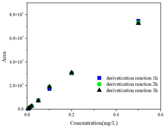All three series of GLUF-P standard solutions from 0.005–0.5 mg/L were derivatized by different reaction times to attain the optimum reaction period. The results are shown in Figure 2. The peak areas of the derivatives corresponding to the same concentration of GLUF-P were similar at 1 h, 2 h, or 3 h, which suggested that the concentrations of the derivatives did not increase significantly after 1 h. Therefore, 1 h was the optimum reaction period. The chromatograms of the derivatives of the control and 0.1 mg/L GLUF-P standard solutions are shown in Figure 3a,b, respectively, and the retention time of GLUF-P derivatives was within 15–17 min.