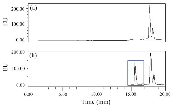 Chromatograms for (a) samples derived from the control sample and (b) 0.1 mg/L standard solution of GLUF-P.