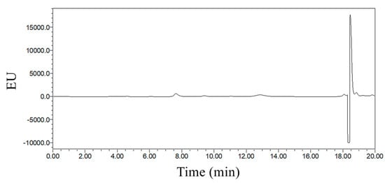 Due to the high water solubility of GLUF-P derivatives, a mobile phase consisting of a high proportion of water was needed to attain sufficient retention on the chromatographic column. Specifically, the proportion of phosphoric acid solution as mobile phase B was between 20% and 80%, and if the samples were separated by a C18 common column, the retention time of the target compounds became increasingly shorter with worse separation efficiencies between the chromatographic peaks, which was called ‘stationary phase collapse’ or ‘hole dewetting’. In addition, the peak area of the target substance would be reduced because of contact area loss. As shown in Figure 6, an ACE-C18 column was used to separate the derivatized products from the control, 0.1 mg/L and 0.5 mg/L GLUF-P, and the chromatographic retention time was 18.0~18.1 min. The target substance could be separated from other impurities well, and the chromatographic peak shape was also good, which was directly related to the characteristics of the ACE-C18 column: the complete phenyl functional group in the stationary phase of the column could prevent ‘hole dewetting’ or subsequent retention time loss. The stationary phase of the ACE-C18 column was composed of ultra-inert and high-purity silica gel, which could maintain the target compound in a good hydrophilic group peak shape.
