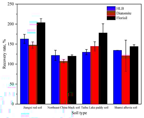 The recoveries in purification experiments in four soils by diatomite, Florisil soil and HLB columns are shown separately (Figure 5). As shown in Figure 5, the average recovery in Northeast black soil purified by diatomite was 106%, and all of the other recoveries in the other three soils were over 120%. Moreover, the RSDs from the Shanxi alluvial soil group were more than 20%, and the recoveries were 125%, 105% and 160%, respectively. The average recoveries in the four soils purified by Florisil soil and HLB columns were all over 120%. Therefore, the performance of the above purifying agents could hardly meet the quality control requirements. It was concluded that the above purifying agents could not completely remove impurities in the soil extracts, which led to obvious interferences from impurities in the derivatives with the chromatographic peaks, and finally, it was difficult to accurately determine the concentrations of the derivatives due to their poor peak widths and shapes.