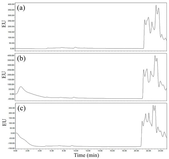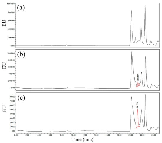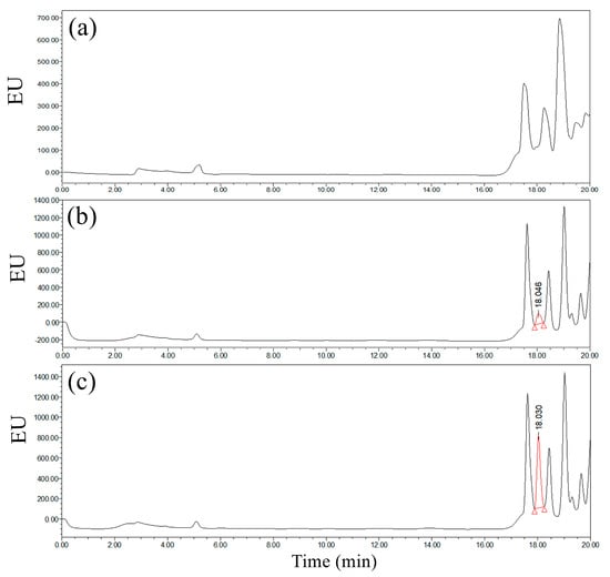 Chromatograms of the RP-C18 column for the (a) sample derived from the blank control, (b) sample derived from the 0.1 mg/L GLUF-P matrix solution, and (c) sample derived from the 0.5 mg/L GLUF-P matrix solution.