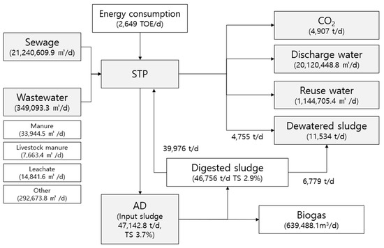 To understand the operation status of STP in Korea, we made a material (SS) flow chart, which used sewage statistics [24] and some assumptions. Inflow was applied to sum the inflowing sewage from all STP (4281 places) and the wastewater (the sum of manure, livestock manure, leachate, and other treated water is applied). The total energy consumption of STP applied the sum of electricity consumption and self-energy consumption (solar power, biogas). The amount of SS generated in the STP was dewatered sludge. Since the amount of digested SS is not in statistics, 72.3% of VS/TS and 30.7% of digestion efficiency were applied [22]. As for the moisture content of the dewatered SS, 74.1%, which is the value obtained by dividing the total amount of water in the dewatered SS generated in an STP with an ADP of the sewage statistics by the amount of dewatered SS was applied.