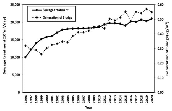 Figure 2 shows the amount of SS generated compared to the amount of sewage treatment from the late 1990s to the 2000s. The annual amount of SS generated in 1996 was 1.17 million tons but increased to 4.21 million tons in 2020. As of 2020, the amount of SS generated treating 1 m3 of sewage was 0.55 kg, and it can be seen that the source unit of SS has continuously increased from 0.35 kg/m3 in the 1990s. Although the amount of SS was increased due to the maintenance of STP in the 2002s, the amount of SS generated compared to the amount of sewage treatment increased rapidly.