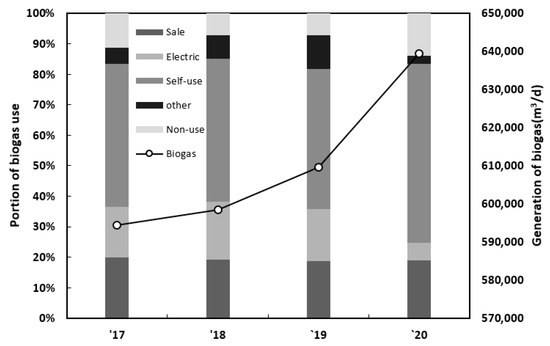 Figure 3 shows the usage status of biogas produced by STP for the period from 2017 to 2020. Biogas production was increasing from 594,478 m3/day to 640,308.1 m3/day. As for the method of use, the number of sales, power generation, and others decreased, and the rate of self-utilization increased. Biogas power generation was known to have the highest economic feasibility, but it seems that the use of biogas power generation has decreased due to difficulties in the operation and maintenance of the biogas generator [25]. The reason for the increase in self-utilization may be that the use of gas in the form of gas is the most economical, but it is also considered to be the cause of the lack of suitable sources of demand.