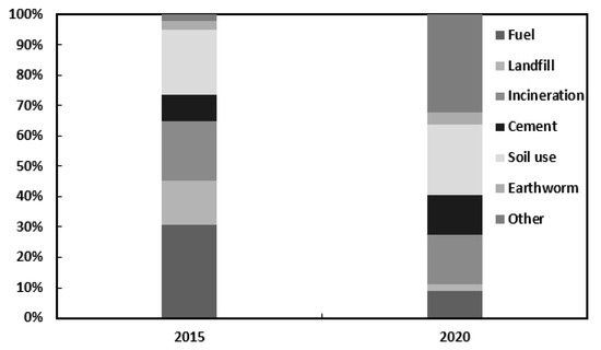 The SS treatment method is not clear in the sewage statistics in Korea [21] and the treatment rate of the main treatment methods, such as cement co-processing, and solid refused fuel (SRF) cannot be confirmed. Therefore, it was prepared using the data on the current status of sludge disposal in 2020 in the Sewerage Information System [23].