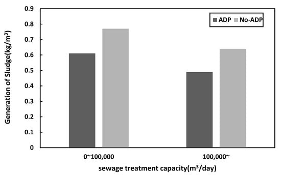 As a result of comparing the amount of SS generated at the facility that installed ADP and without ATP, it was found that there was a reduction effect of about 21–24% depending on the capacity of the STP. It can be seen that the reduction rate of SS after AD is generally low compared to 40–50%. This seems to mean that the ADP of Korean STP is not properly operated.