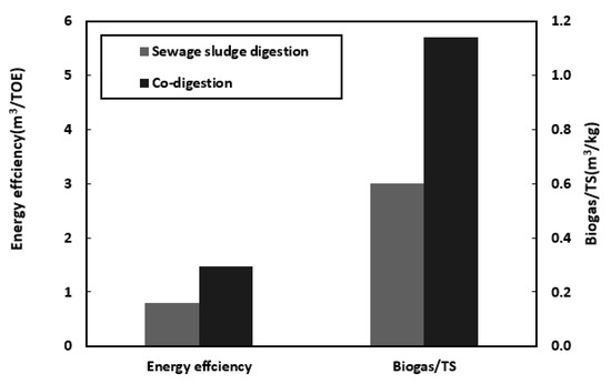 Figure 6 shows the energy efficiency and biogas production yield by AD type (SS-AD and Co-AD). The energy efficiency of SS-AD was 0.79 m3/TOE, and the energy efficiency of Co-AD was 1.47 m3/TOE, which was 86% higher than that of SS-AD. The yield of biogas production was 3.00 m3/TSin-kg for SS-AD and 5.71 m3/TSin-kg for Co-AD, which was 90% higher than that of SS-AD. This means that when AD is carried out in an STP, Co-AD is more advantageous than SS-AD, and it is consistent with existing research cases that existing Co-AD is superior to SS-AD [31].