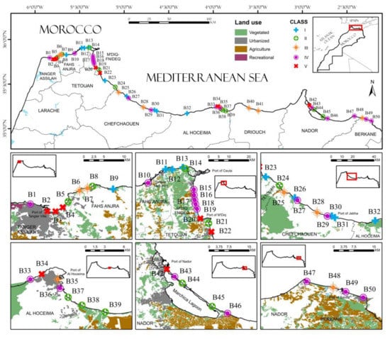 The Moroccan Mediterranean coastline studied in this paper is home to a rich and varied natural heritage, characterized by a rich landscape and an important morphological diversity, such as sandy beaches, cliffs, coves, lagoons, deltas, marshes, and fixed and mobile dunes. The 50 Moroccan Mediterranean beaches selected (Figure 1) are located between Cap Spartel (Tangier) at the westernmost end, and Saïdia at the easternmost end. The sites selected constitute the most frequented beaches and are among the most representative of the characteristics of the Moroccan Mediterranean coastline.