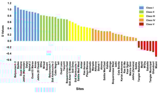 These are unattractive urban sites with intensive development associated with very high human occupation [,], and low landscape values (D ≤ 0). In fact, these urban sites are considered unattractive according to the CSES classification, since this methodology is devoted to natural areas and evaluates the natural landscape and the degree of human intervention; therefore, many urbanized areas obtain low scores. The important characteristic is that the buildings, etc., blend into the surroundings and do not stand out, e.g., Cinque Terre (Italy) and Balneario Camboriu and Copa Cabana (Brazil). So, such areas can be much appreciated places, regardless of showing tall buildings or intense urbanization. The same principle applies here in this study, as sites such as Tangier Municipal, M’Diq, and Martil are very popular but their natural classification is scoring low.