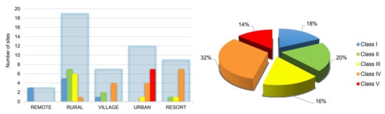 These are natural sites with a very high landscape value (D ≥ 0.85). Along the study sites, 9 out of 50 beaches belong to this class, or 18% of the study sites (Table 2 and Figure 4). Sites are distributed among rural (5), remote (3), and village (1) areas (Figure 4). Class I sites are located in protected natural areas, or remote areas—this is often a requirement to achieve Class I [].