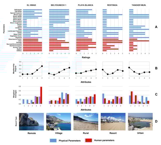 Examples of the site characteristics and status of the physical and human parameters for each class from I to V (left to right), with their respective (A) scenic evaluation rating histograms, (B) membership degree curve, (C) scenic histograms of the weighted averages, and (D) beach typology for El Hwad (Class I, Remote), Belyounech 1 (Class II, Village), Playa Blanca (Class III, Rural), Restinga (Class IV, Re-sort), and Tangier Municipal (Class V, Urban).