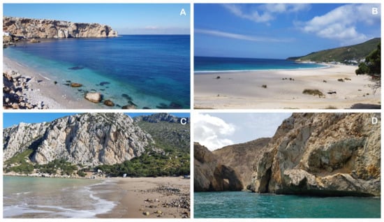 Marqala and Calabonita are two beaches close to the city centres of Tangier and Al Hoceima. The site of Marqala is a small coast of several coves (Figure 7E); the beach is triangle-shaped, with fine clean golden sand and clear blue water, bordered by high cliffs covered by dense vegetation with an extensive flattened rocky platform. The site of Calabonita is a small cove, surrounded between two rocky limestone cliffs. Both sites are similar; their location close to urban centres greatly attenuates the human parameters, such as the presence of sewage.