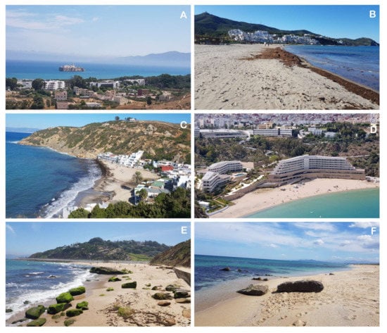 Examples of the characteristics of the physical and human parameters of Class II sites ((A), Sfiha; (B), Cabo Negro), Class III ((C), Playa Blanca; (D), Quemado), and Class IV ((E), Marqala; (F), Rifienne).