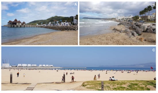 Last, the investigated sites were divided into different typologies according to the classification of Williams and Micallef [] and Williams []. This method classifies beaches on the degree of anthropogenic influence as remote, rural, village, urban, and resort, considering criteria such as accessibility, environmental conditions, habitation/accommodation level, and community services, with the purpose of demonstrating the method and ease of application to diverse coastal environments. For more details about this type of classification, see the papers mentioned above [,].