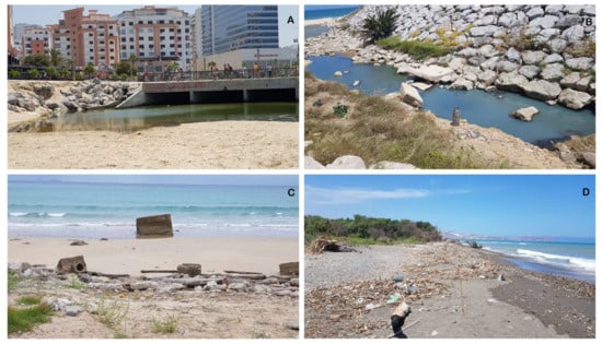- Class V: This class presents beaches located in highly urbanized areas. Litter, sewage, noise disturbance, and facilities are the main factors of degradation (Figure 9A,C). It is difficult to improve the impact of infrastructure, especially in terms of cost, but other factors can be easily improved.