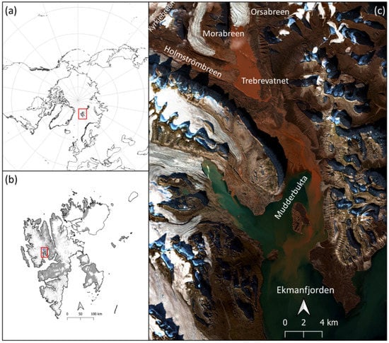 (a) Study site location; Svalbard within the Arctic region; (b) Central Svalbard with location of Ekmanfjorden; (c) Sentinel-2 image (2 September 2021) of the study area with the Trebrevatnet lake filled with suspended sediments on top of the image together with the sediment plume visible on the outlet to the Ekmanfjorden.