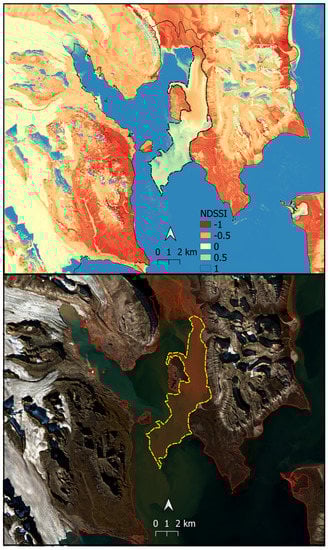 The index resulting from the formula is used to estimate SSC in the water and ranges from −1 to 1. The lower the index the higher the SSC. Calibration with in situ measurements is necessary to estimate the absolute values of SSC in the study site. This was, however, not possible, so the average NDSSI index (over the sediment plume area) was considered as a proxy value. To bridge this limitation, we developed an index combining the NDSSI and the areal extent of the plume. The NDSSI index was turned into a 0–1 index of SSC intensity (where 0 is fjord water, 1 is the 100% suspension of sediment in fjord waters). By multiplying the areal extent with the SSC intensity, we obtained a parameter reflecting both the area and SSC. This enables us to compare plumes of different size with different SSCs.