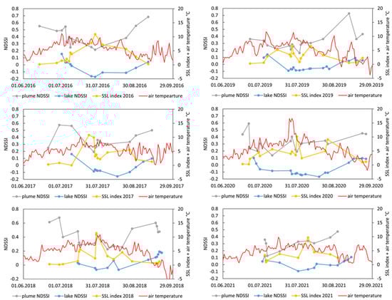 All the parameters studied show significant seasonal development (Figure 3). NDSSI indexes for both Trebrevatnet lake water and sediment plumes within Ekmanfjorden decreased until the end of July or beginning of August before starting to increase again. The peak of the NDSSI in sediment plumes usually preceded the peak in NDSSI at Trebrevatnet. The later peak in the NDSSI in the lake may be attributed to continual deposition of fine-grained mineral material in the lake, whereas the sediment plumes in the fjord react more rapidly to actual sediment and meltwater input. The seasonal evolution of suspended sediment load (SSL) in Ekmanfjorden corresponds well with the observed sediment transport dynamics from different parts of Svalbard–Kronebreen in NW Svalbard [,]; Tunabreen in central Svalbard []; and Hansbreen in southern Svalbard []. Similar behaviour was observed also in different parts of the Arctic (e.g., []).