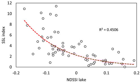 Relationship between lake NDSSI and sediment plume SSL index with the highlighted exponential regression.