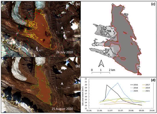 Seasonal dynamics of Trebrevatnet areal extent; examples of (a) maximum and (b) minimum areal extent from 26 July 2020 and 25 August 2020 respectively; (c) the areal extent variability expressed as overlapping lake extent during the 2020 summer season with minimum highlighted in red and maximum in black; (d) comparison of the seasonal lake areal extent evolution within the studied years.